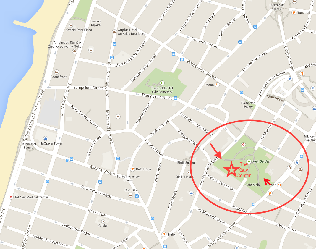 The conference will take place at the Tel Aviv Gay Center, at Gan Meir (22 Tsernichovsky Street). You can see this illustration for exact location (the Center is located at a Park and the best access is from King George Street).